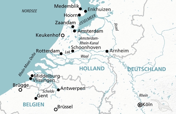 Köln  - Rotterdam - Antwerpen - Gent - Middelburg - Vlissingen - Schoonhoven - Amsterdam - Hoorn - Medemblik - Enkhuizen - Arnheim - Köln