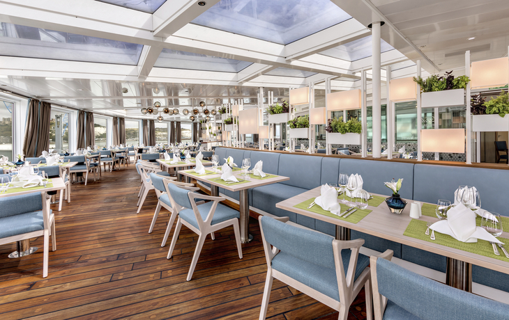 Alle Kabinen liegen außen, sind komfortabel und elegant eingerichtet mit französischem Balkon, raumhoher Fensterfront und Schiebetür.