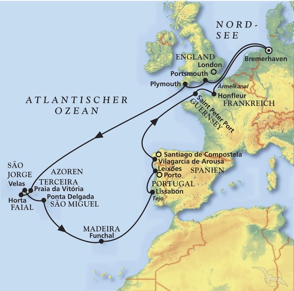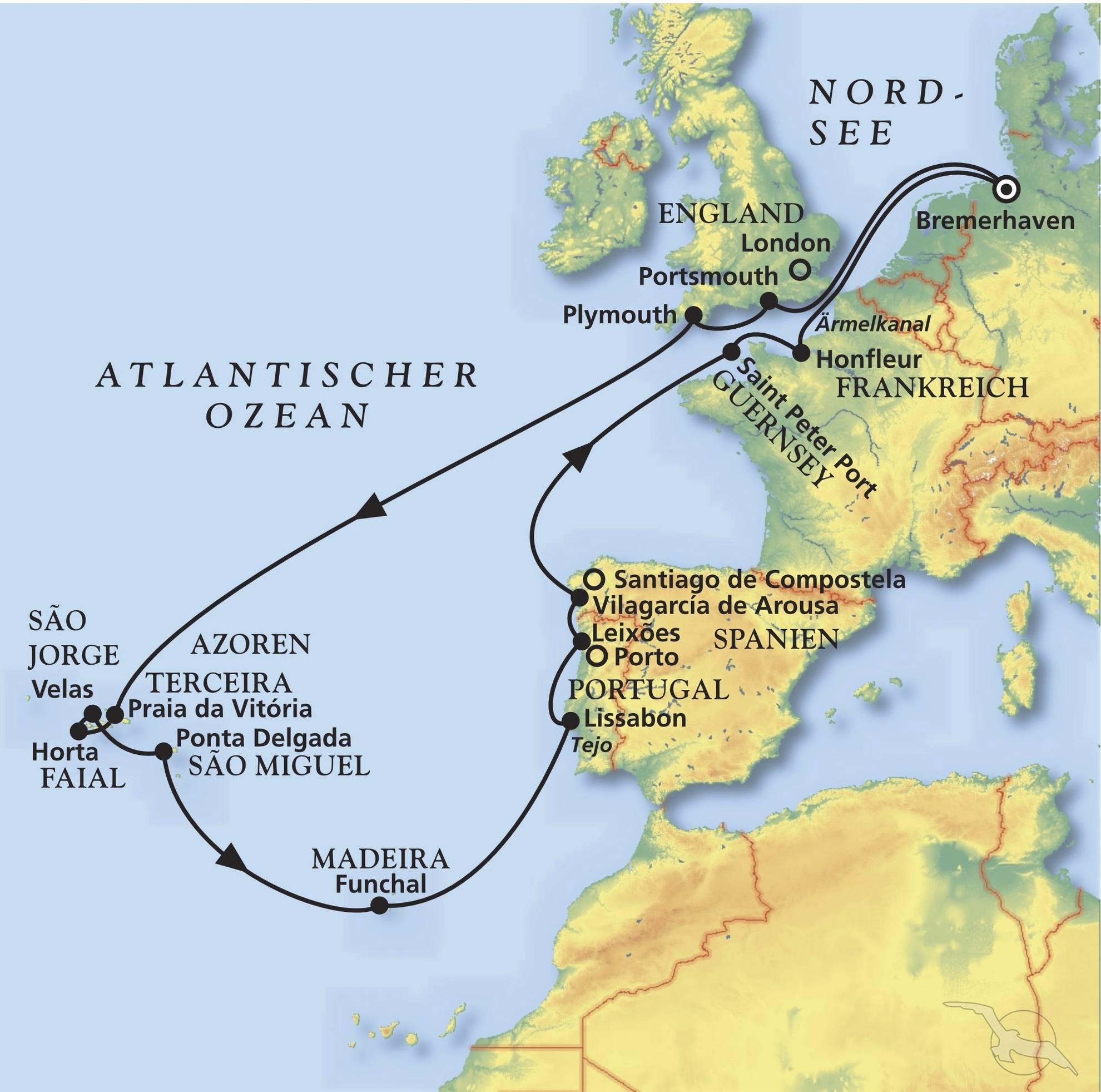 Bremerhaven - Portsmouth - Plymouth - Terceira - Faial - Ponta Delgada - Funchal - Lissabon - Porto - Honfleur - Bremerhaven