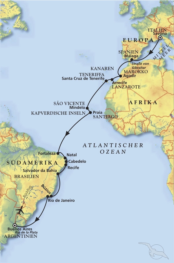 Sie fahren mit dem Bus entlang der schönen Strände und der Lagune Rodrigo de Freitas und erreichen das Viertel Cosme-Velho mit historischen Herrenhäusern aus der Jahrhundertwende, die am Fuße des Corcovado erbaut wurden. Von hier aus erfolgt die Auffahrt mit der Zahnradbahn zum 709 m hohen Gipfel des Berges. Rolltreppen führen zur monumentalen Christusstatue, die mit ausgebreiteten Armen als Erlöser schützend ihre Hände über die Stadt hält. Der Ausblick auf die Stadt Rio de Janeiro wird als einer der schönsten der Welt gepriesen. Nach dem Besuch fahren Sie mit der Zahnradbahn wieder hinab und weiter mit dem Bus zum São Conrado Strand. Hier haben Sie etwas Freizeit und Gelegenheit, Ihr Lunchbox-Mittagessen einzunehmen. Weiterfahrt zur Guanabara-Bucht. Mit der Drahtseilbahn fahren Sie auf den Zuckerhut. Von hier oben haben Sie bei gutem Wetter einen klaren Blick auf die gesamte Bucht, das Häusermeer von Rio, die Strände, den Corcovado und die Rio-Niterói-Brücke am Horizont. Die Rückfahrt zum Hafen führt an den Stränden von Urca, Botafogo und Flamengo vorbei sowie durch den historischen und modernen Teil des Stadtzentrums. Bankhäuser und Wolkenkratzer wechseln sich mit Gebäuden im Kolonialstil ab.