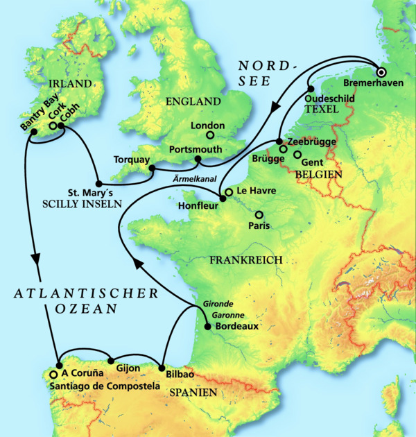 Bremerhaven - Portsmouth - Torquay - Cobh (Cork) - Bantry Bay - A Coruña - Getxo (Bilbao) - Bordeaux - Honfleur - Oudeschild (Insel Texel) - Bremerhaven