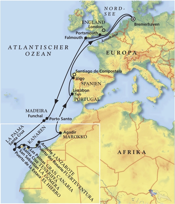 Bremerhaven - Portsmouth - Falmouth - Funchal - La Palma - El Hierro - Santa Cruz de Teneriffa - Las Palmas - Arrecife - Lissabon - Vigo - Bremerhaven
