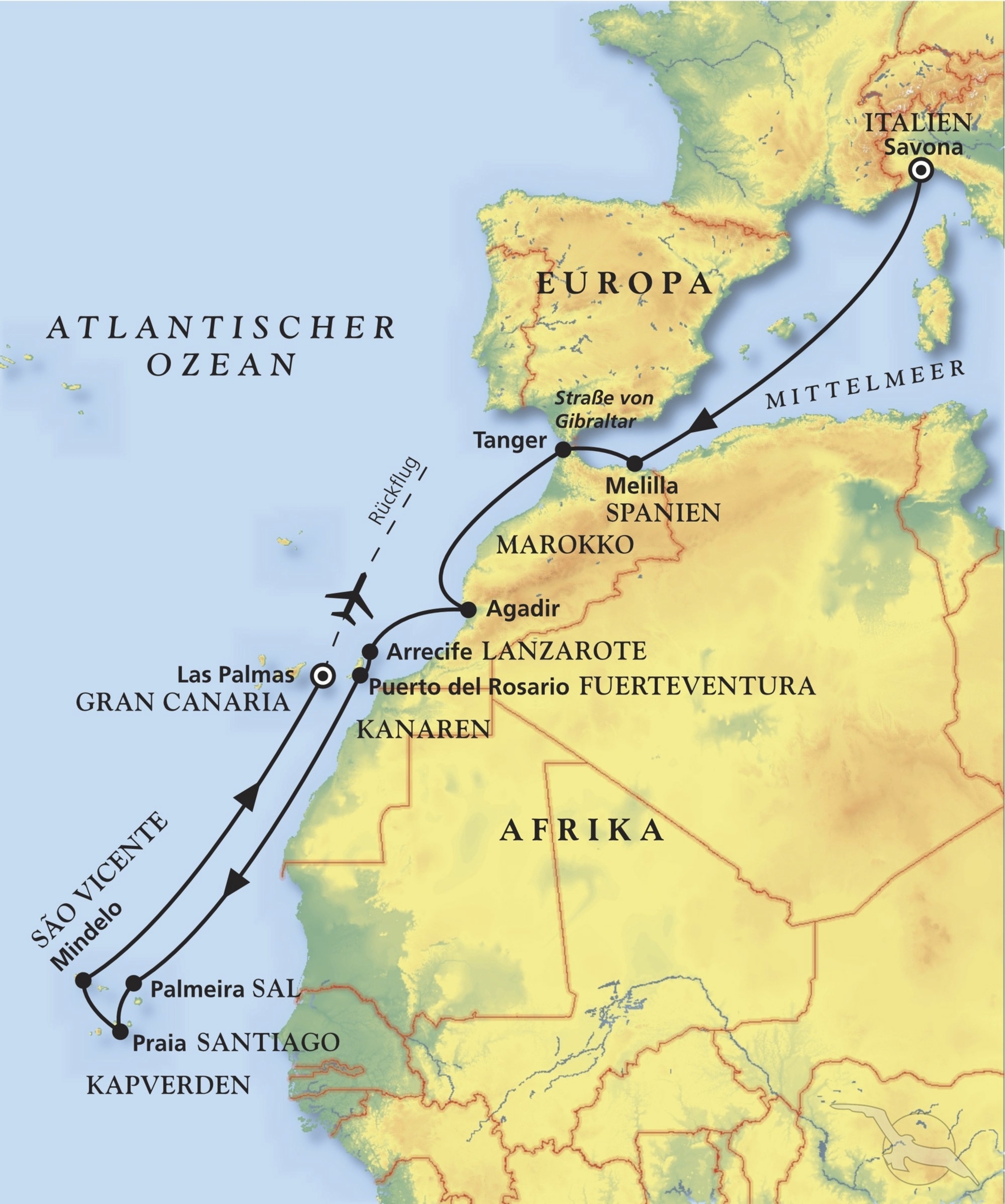 Savona - Agadir - Arrecife - Puerto del Rosario - Palmeira - Praia - Mindelo - Las Palmas