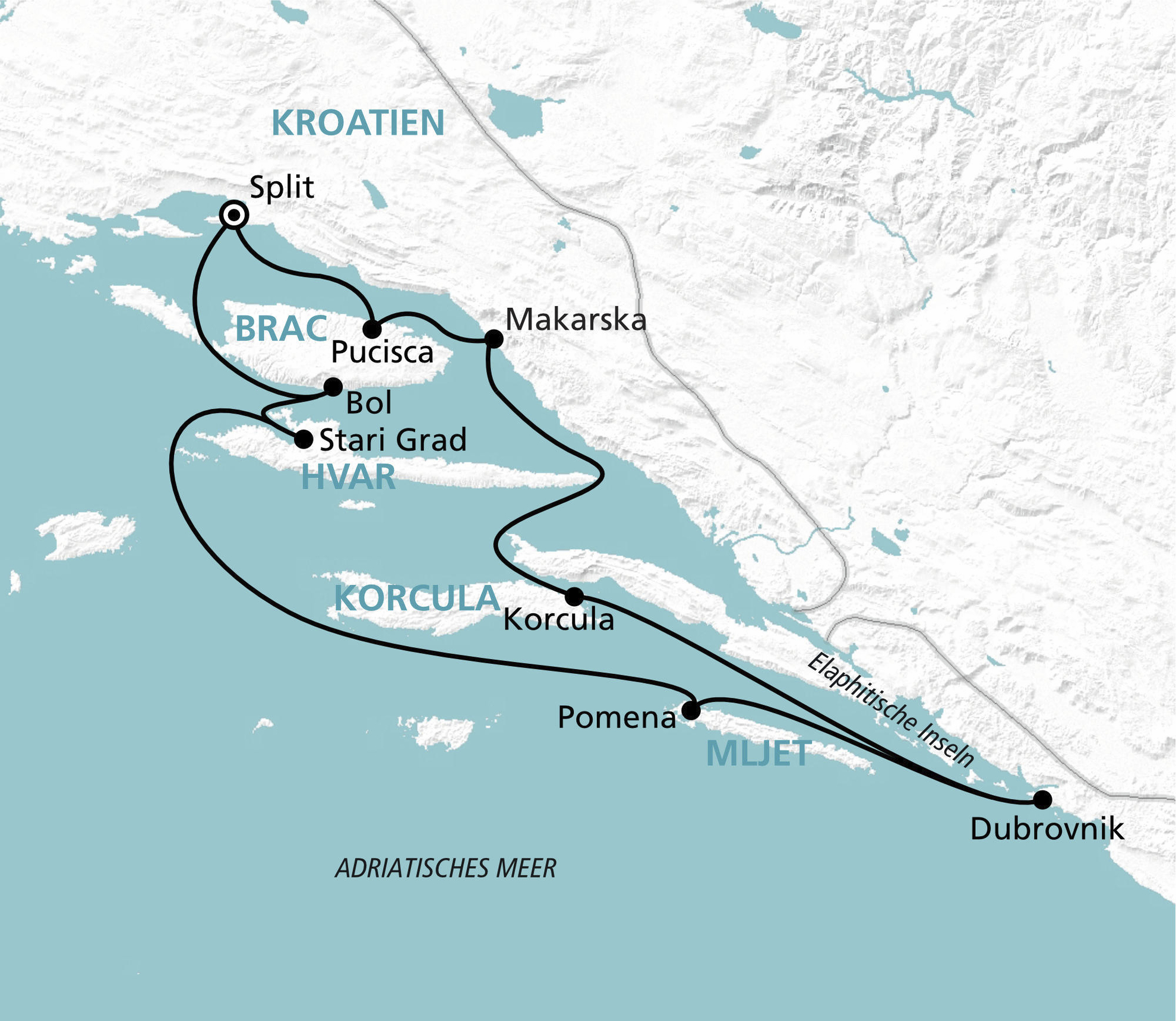 Split - Insel Brac - Insel Hvar - Dubrovnik - Insel Mljet - Insel Korcula - Insel Brac - Split