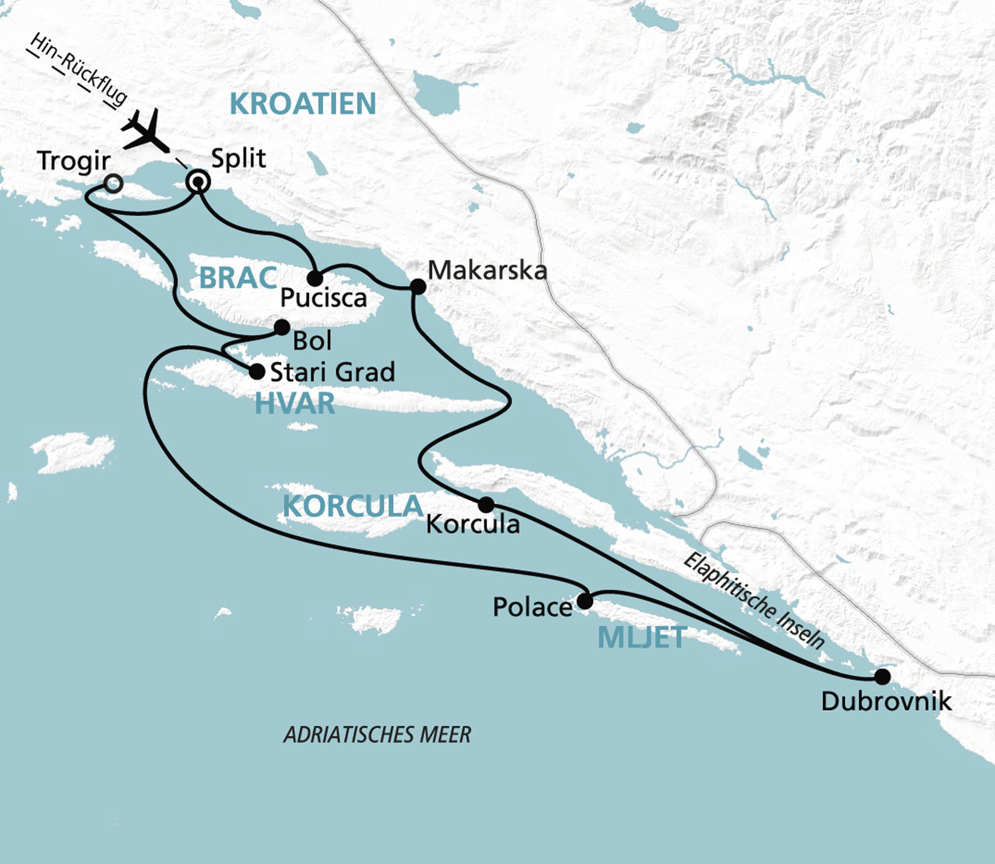 Split - Insel Brac - Insel Hvar - Dubrovnik - Insel Mljet - Insel Korcula - Insel Brac - Split