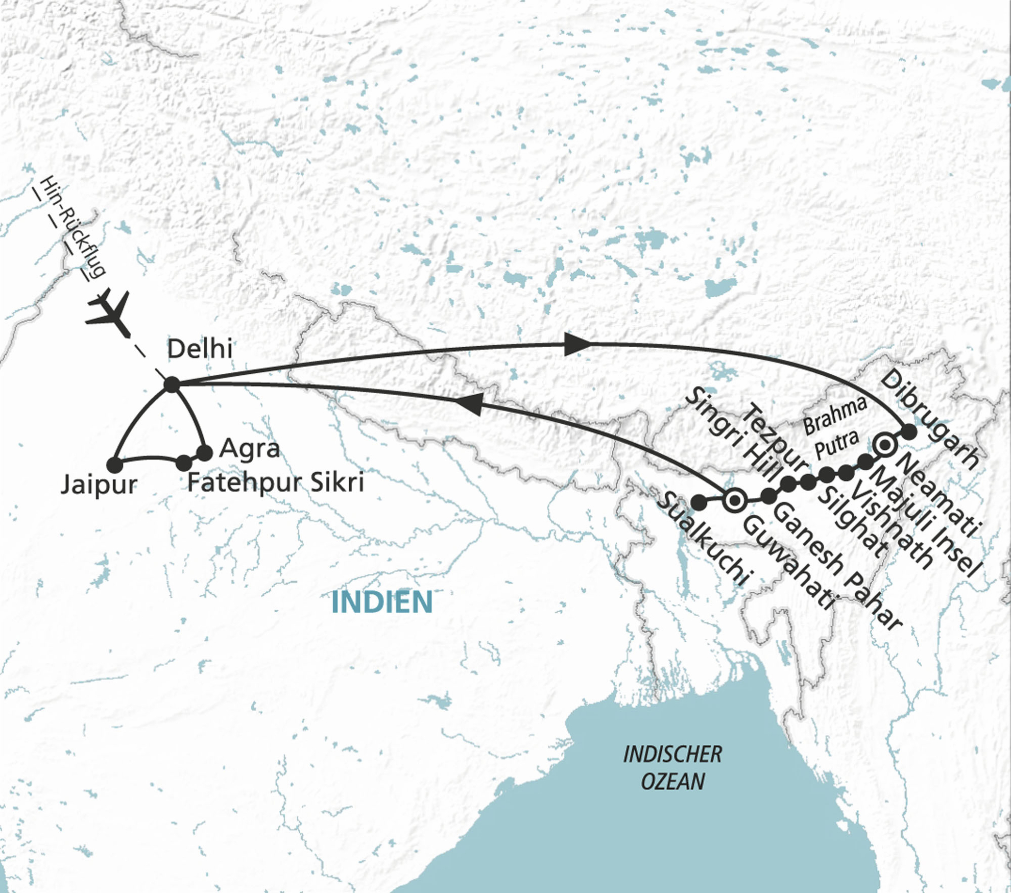 Landprogramm Delhi, Flussfahrt Neamati - Vishnath - Silghat - Tezpur - Guwahati, Landprogramm Jaipur - Agra