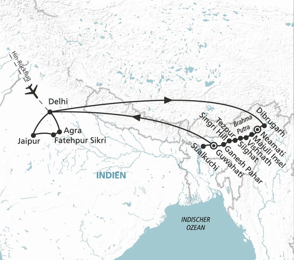 In diesem Jahr bieten wir wieder Reisen nach Indien mit der komfortablen MS Charaidew II an. Nach einem zweitägigen Aufenthalt in Delhi erwartet Sie Ihr Schiff am großen Brahmaputra-Strom. Sie kreuzen stromabwärts zur Majuli Insel, der angeblich größten Flussinsel der Welt. Weiter auf Ihrer Reise besuchen Sie den West-, Zentral- und Ostteil des Kaziranga-Nationalparks. Mit etwas Glück sehen Sie auf den Safaris im Kaziranga-Nationalpark Tiger, Büffel, Hirsche, Nashörner, wilde Elefanten sowie viele seltene Tierarten wie Goldlanguren-Affen. Anschließend besuchen Sie das Mising-Minderheitendorf. Von Tezpur aus werden Sie mit einer Fahrradrikscha zum Da Parbatia-Tempel gebracht und erkunden danach die Stadt. Sie kreuzen weiter stromabwärts nach Guwahati, wo Ihre Reise mit MS Charaidew II zu Ende geht. Die letzten Tage Ihrer Reise setzen Sie über Land fort und sehen die Highlights von Jaipur und Agra.