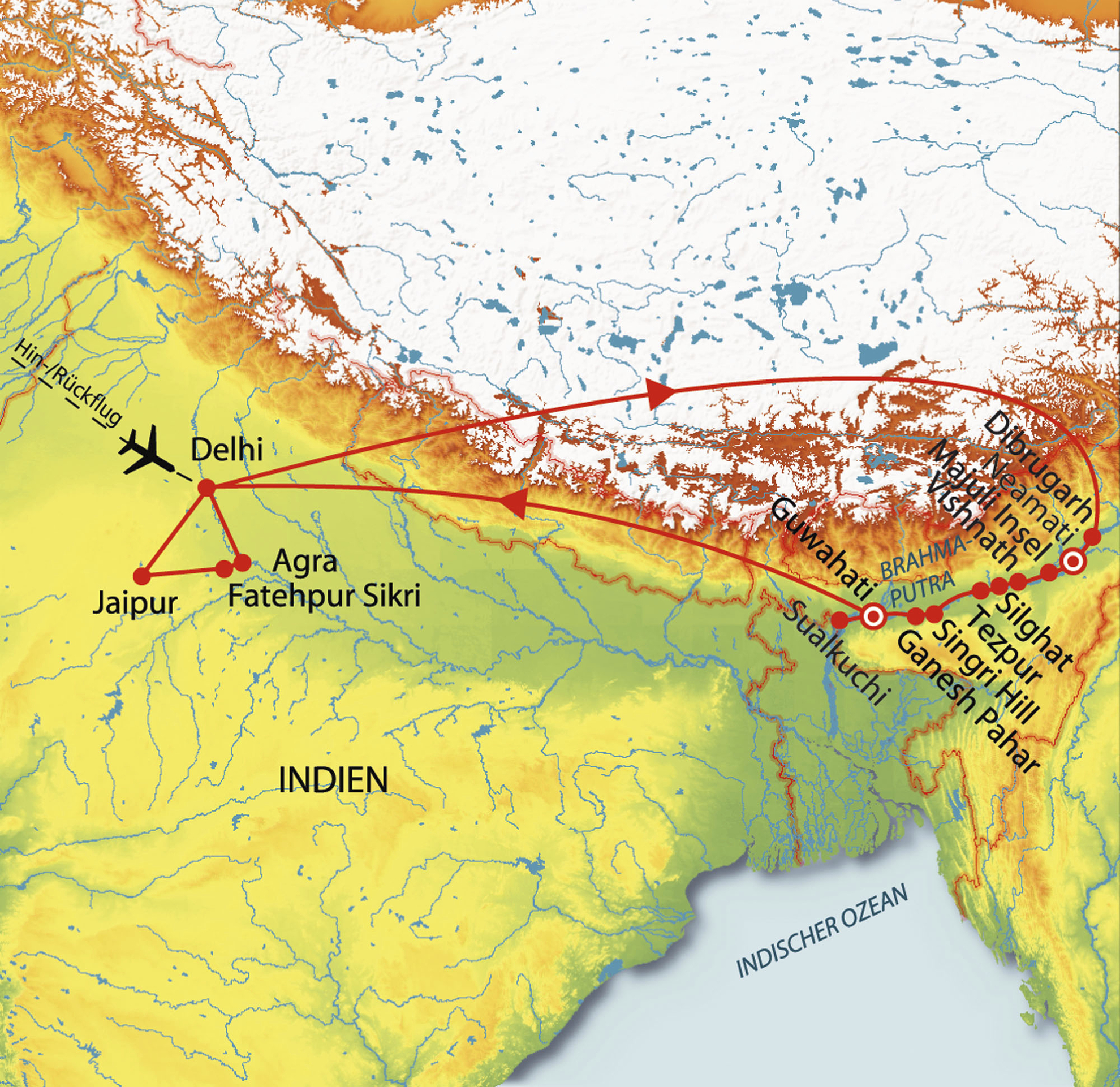 Nach einem zweitägigen Aufenthalt in Delhi erwartet Sie am großen Bramaputra-Strom unsere MS Sukapha. Sie kreuzen stromabwärts zur Majuli Insel, der angeblich größten Flussinsel der Welt. Weiter auf Ihrer Reise besuchen Sie den West-, Zentral- und Ostteil des Kaziranga-Nationalparks. Mit etwas Glück sehen Sie auf den Safaris im Kaziranga-Nationalpark Tiger, Büffel, Hirsche, Nashörner, wilde Elefanten sowie viele seltene Tierarten wie Goldlanguren-Affen. Anschließend besuchen Sie das Mising-Minderheitendorf. Von Tezpur aus werden Sie mit einer Fahrradrikscha zum Da Parbatia-Tempel gebracht und erkunden danach die Stadt. Sie kreuzen weiter stromabwärts nach Guwahati, wo Ihre Reise mit MS Sukapha zu Ende geht. Die letzten Tage Ihrer Reise setzen Sie über Land fort und sehen die Highlights von Jaipur und Agra.