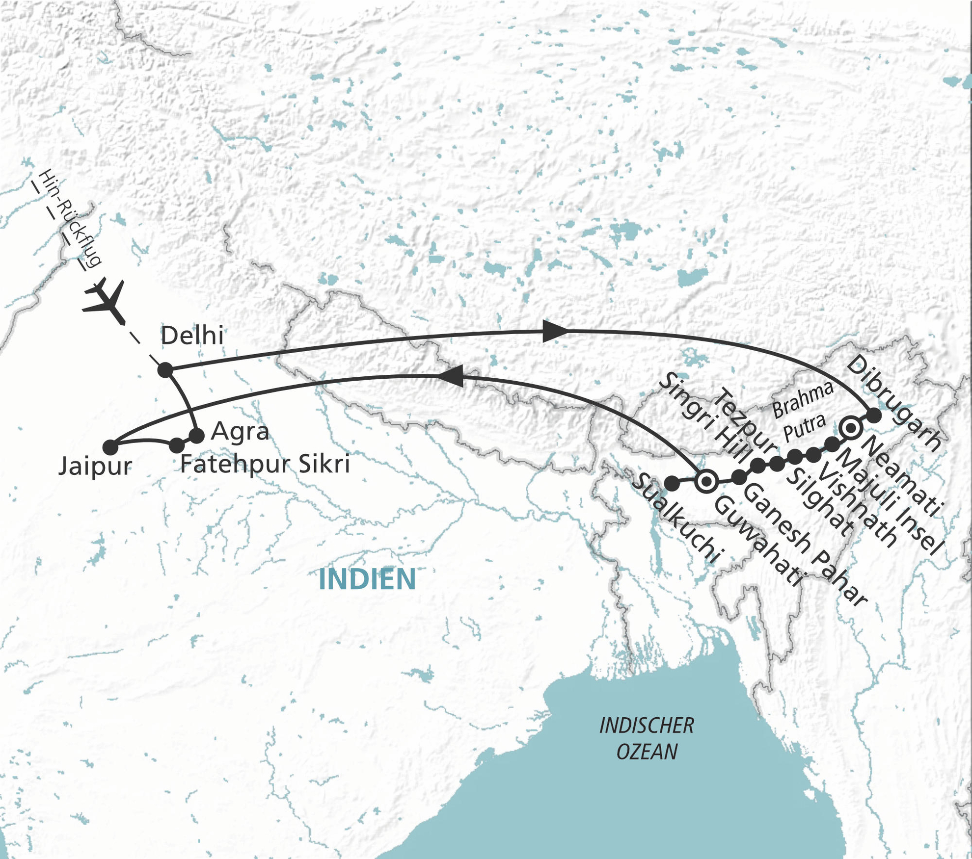 Nach einem zweitägigen Aufenthalt in Delhi erwartet Sie am großen Bramaputra-Strom unsere MS Sukapha. Sie kreuzen stromabwärts zur Majuli Insel, der angeblich größten Flussinsel der Welt. Weiter auf Ihrer Reise besuchen Sie den West-, Zentral- und Ostteil des Kaziranga-Nationalparks. Mit etwas Glück sehen Sie auf den Safaris im Kaziranga-Nationalpark Tiger, Büffel, Hirsche, Nashörner, wilde Elefanten sowie viele seltene Tierarten wie Goldlanguren-Affen. Anschließend besuchen Sie das Mising-Minderheitendorf. Von Tezpur aus werden Sie mit einer Fahrradrikscha zum Da Parbatia-Tempel gebracht und erkunden danach die Stadt. Sie kreuzen weiter stromabwärts nach Guwahati, wo Ihre Reise mit MS Sukapha zu Ende geht. Die letzten Tage Ihrer Reise setzen Sie über Land fort und sehen die Highlights von Jaipur und Agra.