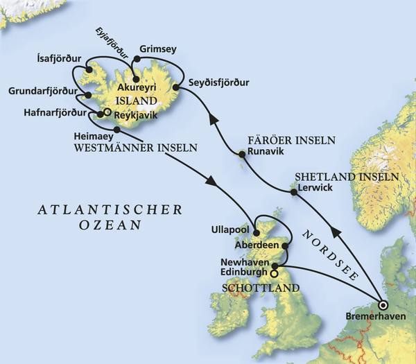 Bremerhaven - Lerwick - Akureyri - Reykjavik - Heimaey - Ullapool - Newhaven (Edinburgh) - Bremerhaven
