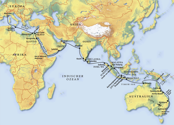Nizza - Valletta - Suez-Kanal - Salalah - Muscat - Mumbai - Colombo - Port Kelang - Singapur - Benoa - Cairns - Townsville - Brisbane - Sydney