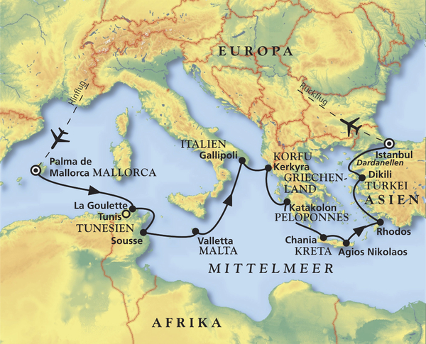 Palma de Mallorca - La Goulette (Tunis) - Sousse - Valletta - Gallipoli - Kerkyra - Katakolon - Chania - Rhodos - Dikili - Istanbul
