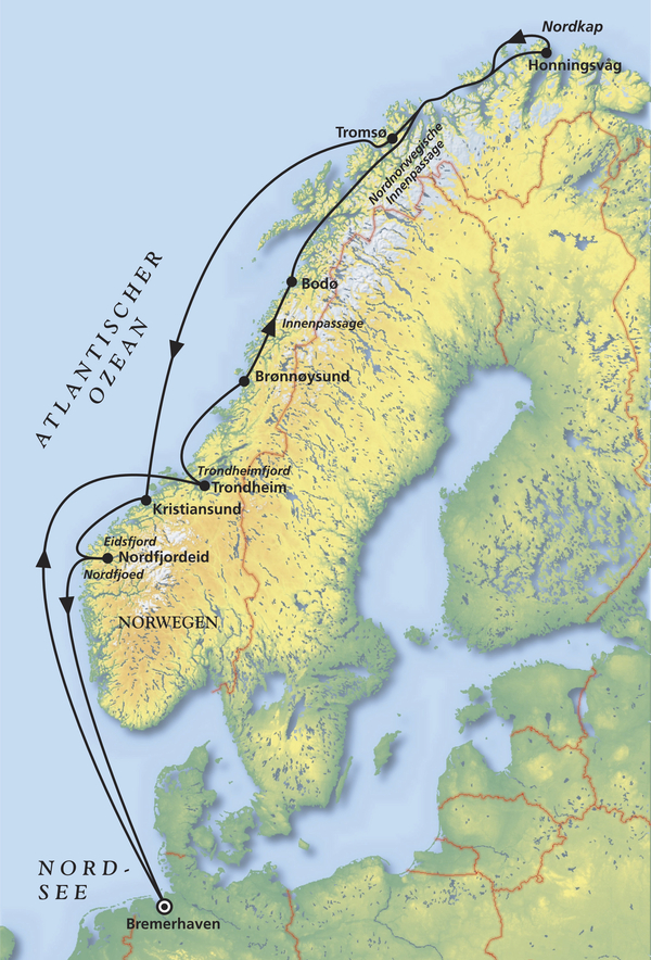 Bremerhaven - Trondheim - Brønnøysund - Bodø - Honningsvåg (Nordkap) - Tromsø - Kristiansund - Nordfjordeid - Bremerhaven