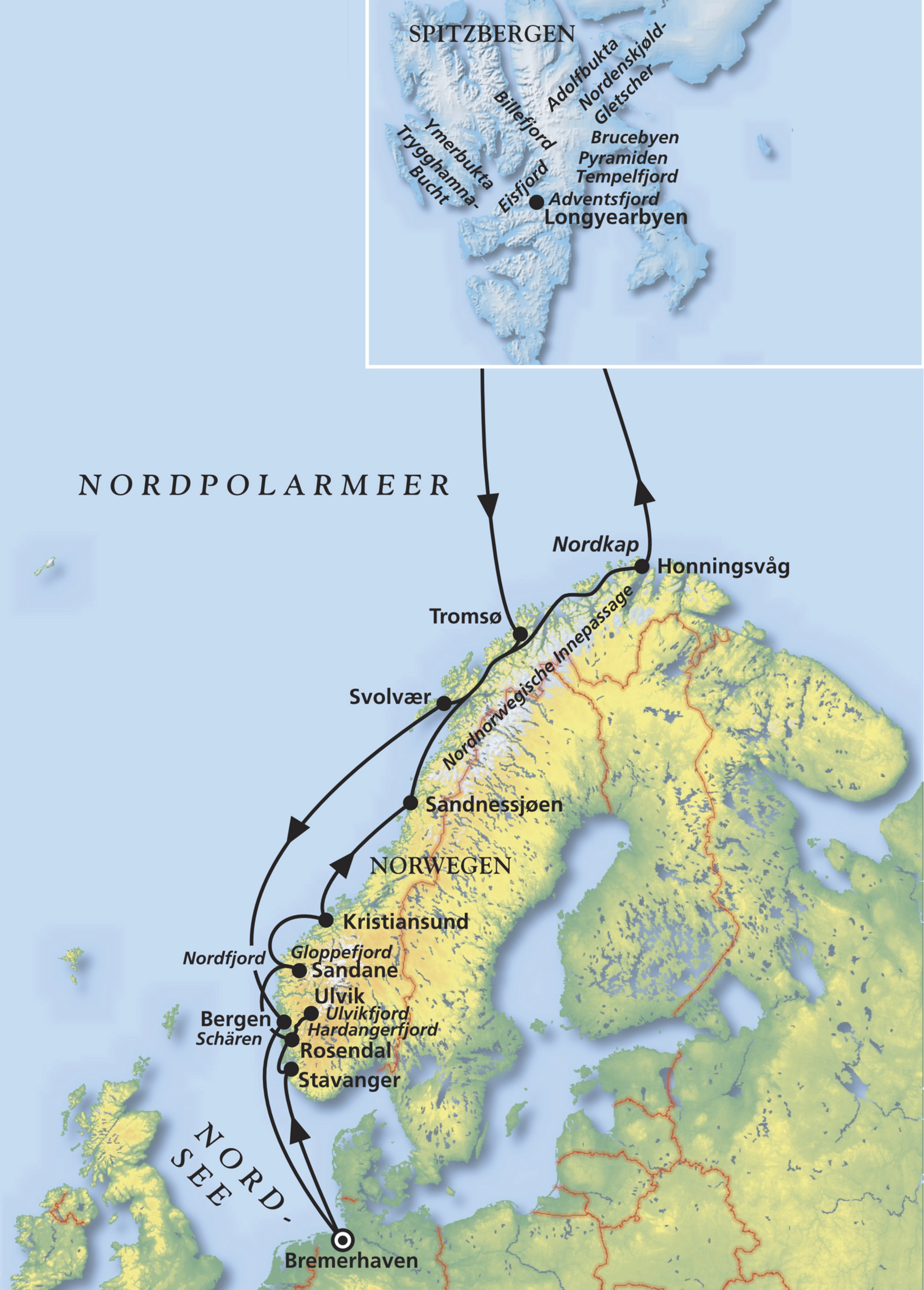 Bremerhaven - Stavanger - Ulvik - Kristiansund - Nordkap - Spitzbergen - Tromsø - Bergen - Bremerhaven