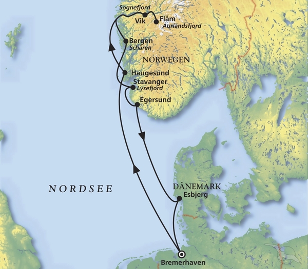 Bremerhaven - Haugesund - Flåm - Bergen - Stavanger - Esbjerg - Bremerhaven