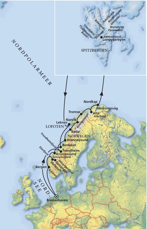 Bremerhaven - Trondheim - Bodø - Tromsø - Alta - Honningsvåg (Nordkap) - Spitzbergen - Geiranger - Bergen - Bremerhaven