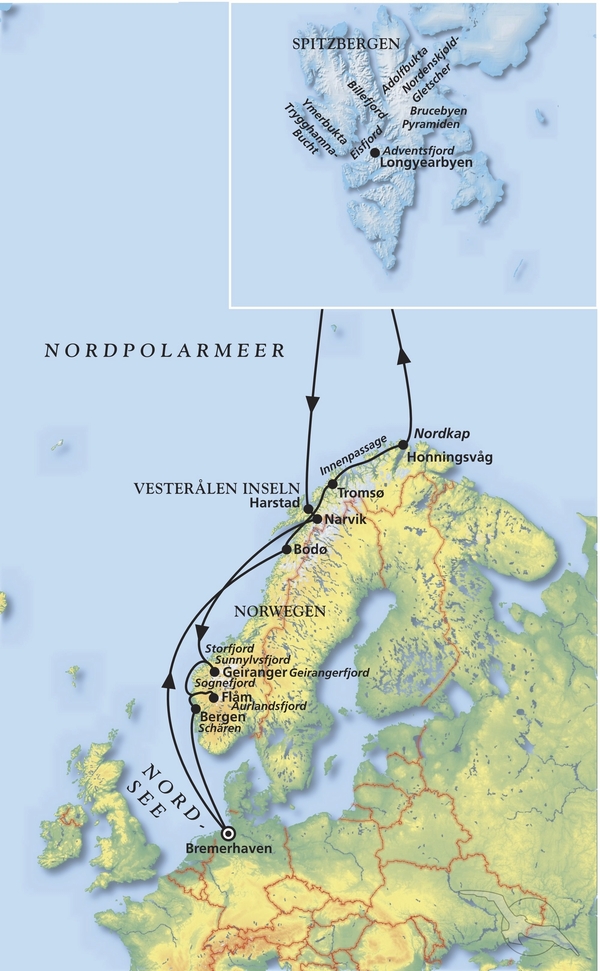 Bremerhaven - Bodø - Tromsø - Honningsvåg (Nordkap) - Spitzbergen - Narvik - Geiranger- Flåm - Bergen - Bremerhaven
