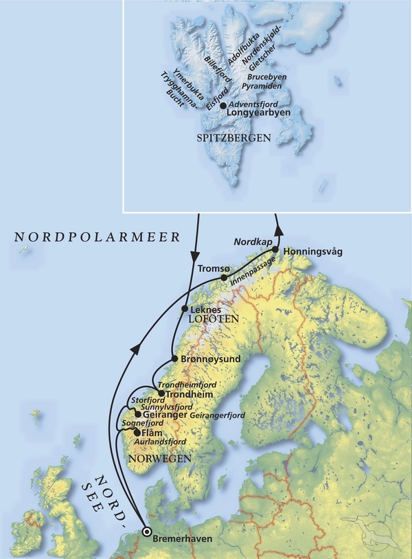 Bremerhaven - Tromsø - Honningsvåg - Nordkap - Spitzbergen - Leknes - Brønnøysund - Trondheim - Geiranger - Flåm - Bremerhaven