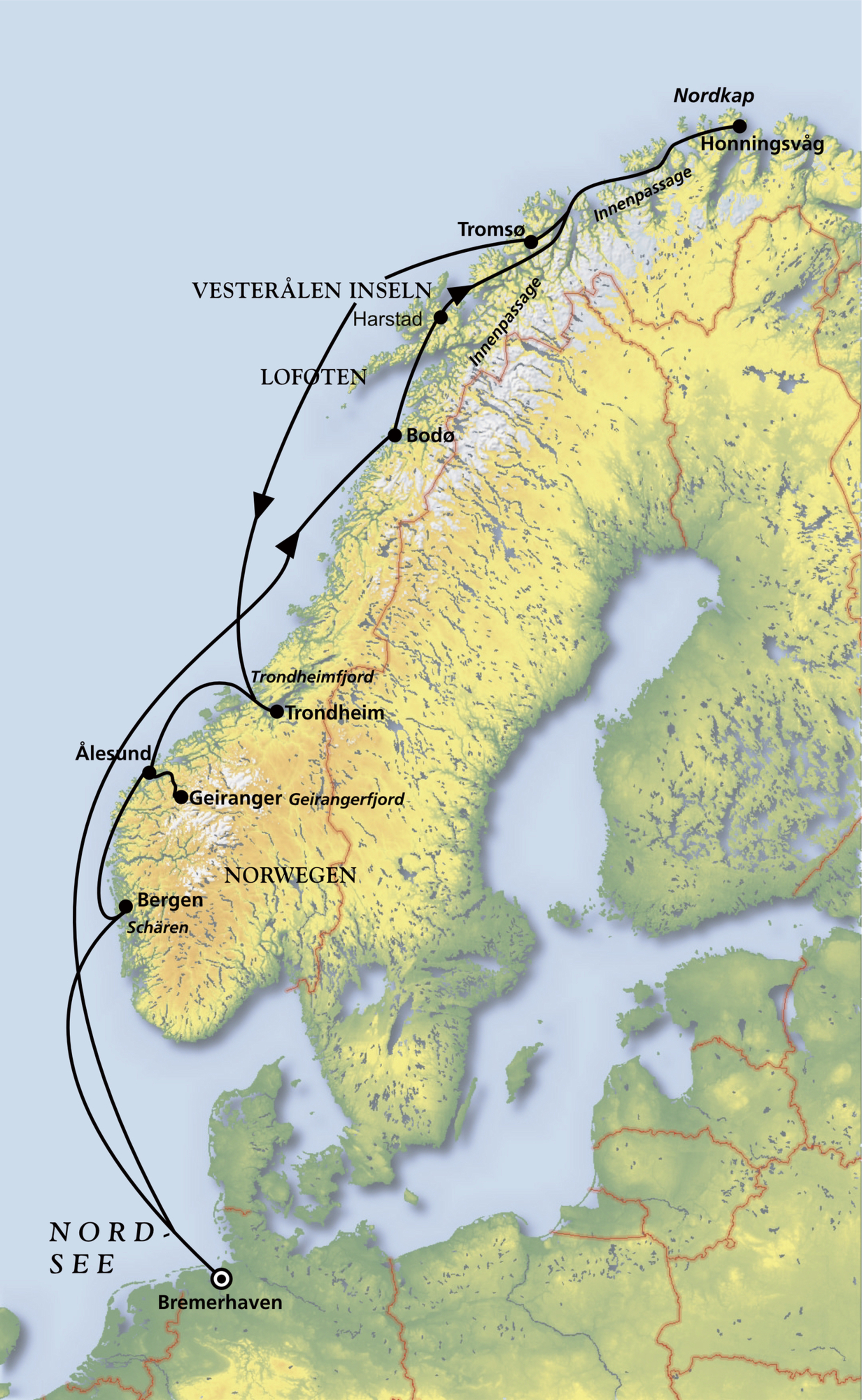 Bremerhaven - Honnigsvag (Nordkap) - Tromsö - Alesund - Geiranger - Bergen - Bremerhaven