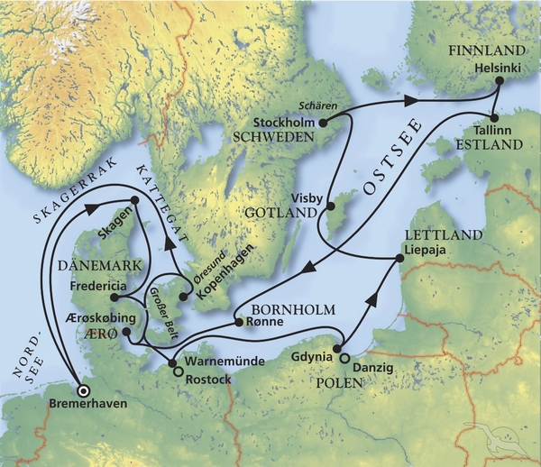 Bremerhaven - Skagen - Fredericia - Warnemünde (Rostock) - Gdynia (Danzig) - Visby - Stockholm - Helsinki - Tallinn - Kopenhagen - Bremerhaven