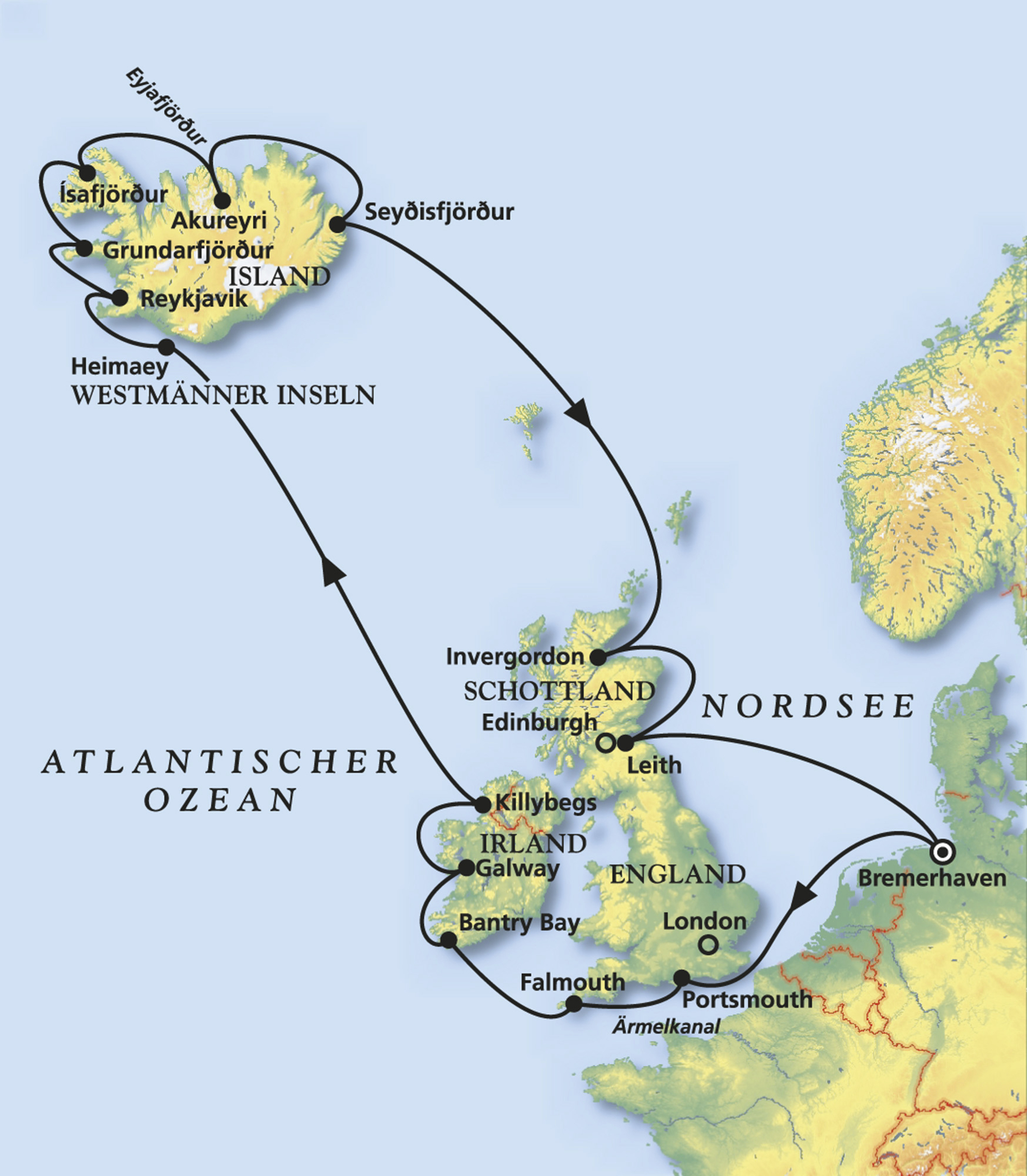 Bremerhaven - Portsmouth - Galway - Reykjavik - Grundafjöðrur - Seyðisfjörður - Akureyri - Invergordon (Inverness) - Leith (Edinburgh) - Bremerhaven