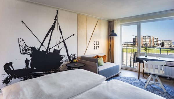 Deluxe-Zimmer: bei gleicher Ausstattung geräumiger, zusätzlich mit Sitzecke & Balkon, zur Seeseite.
