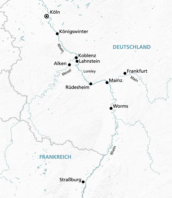 Köln - Lahnstein - Loreley - Rüdesheim - Frankfurt - Worms - Straßburg - Mainz - Alken - Koblenz - Köln