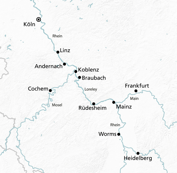 Köln - Cochem - Koblenz - Loreley - Mainz - Frankfurt - Heidelberg - Worms - Rüdesheim - Braubach - Andernach - Linz - Köln