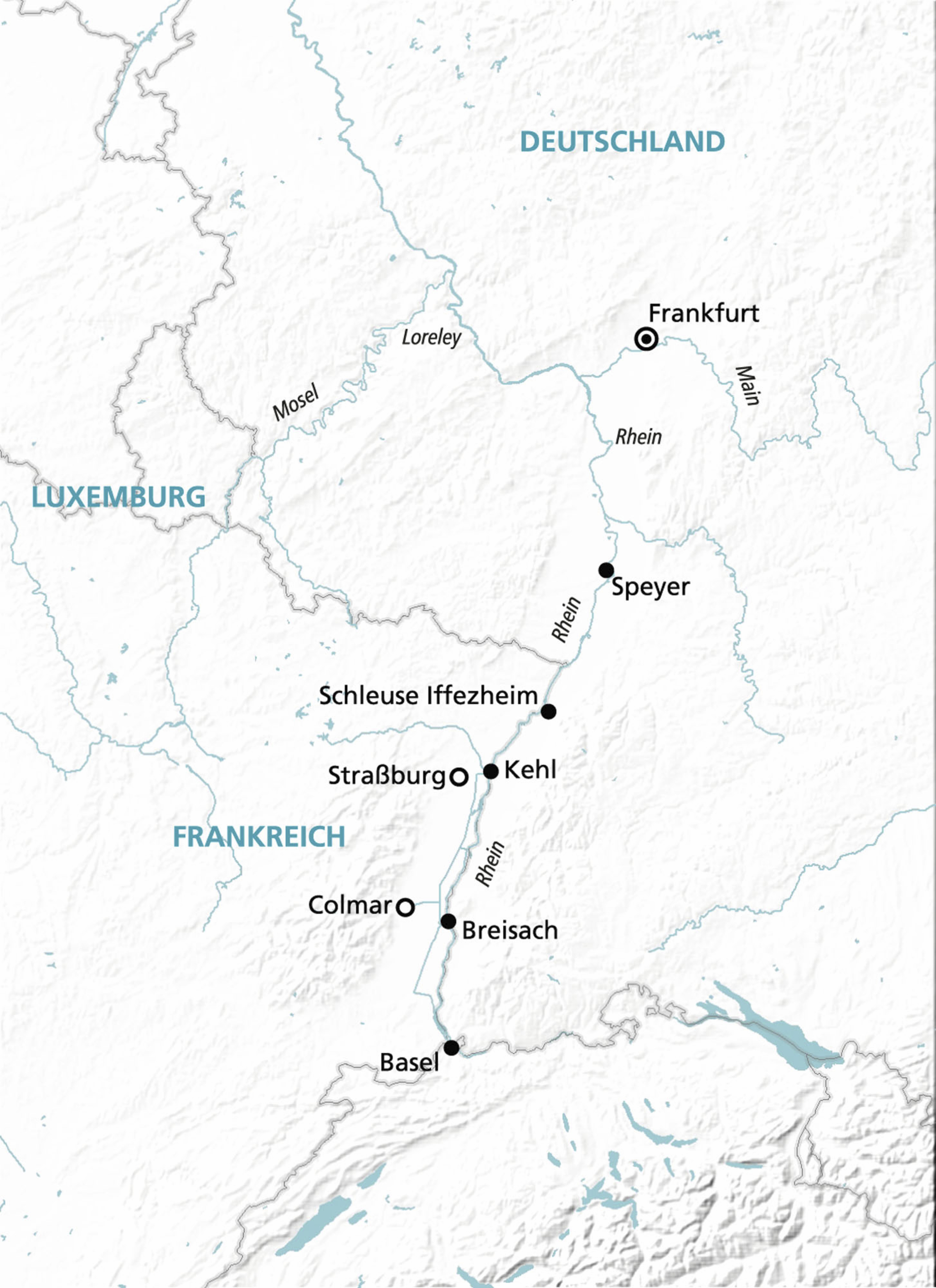 Auf unserer neuen 5-tägigen Route zeigen wir Ihnen die schönsten Regionen und Städte entlang des Oberrheins. In Frankfurt gehen Sie an Bord unseres First-Class-Schiffes MS Alena und genießen in Kürze alle Annehmlichkeiten einer Flussreise, während Sie wunderschöne Landschaften passieren. Unsere aufmerksame Crew wird Sie die nächsten Tage mit einem hervorragenden Service verwöhnen. Sie besuchen die Städte Speyer und Breisach mit verschiedenen Ausflugsmöglichkeiten. Anschließend stehen die Höhepunkte dieser Reise mit Basel und Straßburg auf dem Programm. Erkunden Sie die Städte auf unseren Ausflügen oder auf eigene Faust. Es gibt viel Schönes zu entdecken.