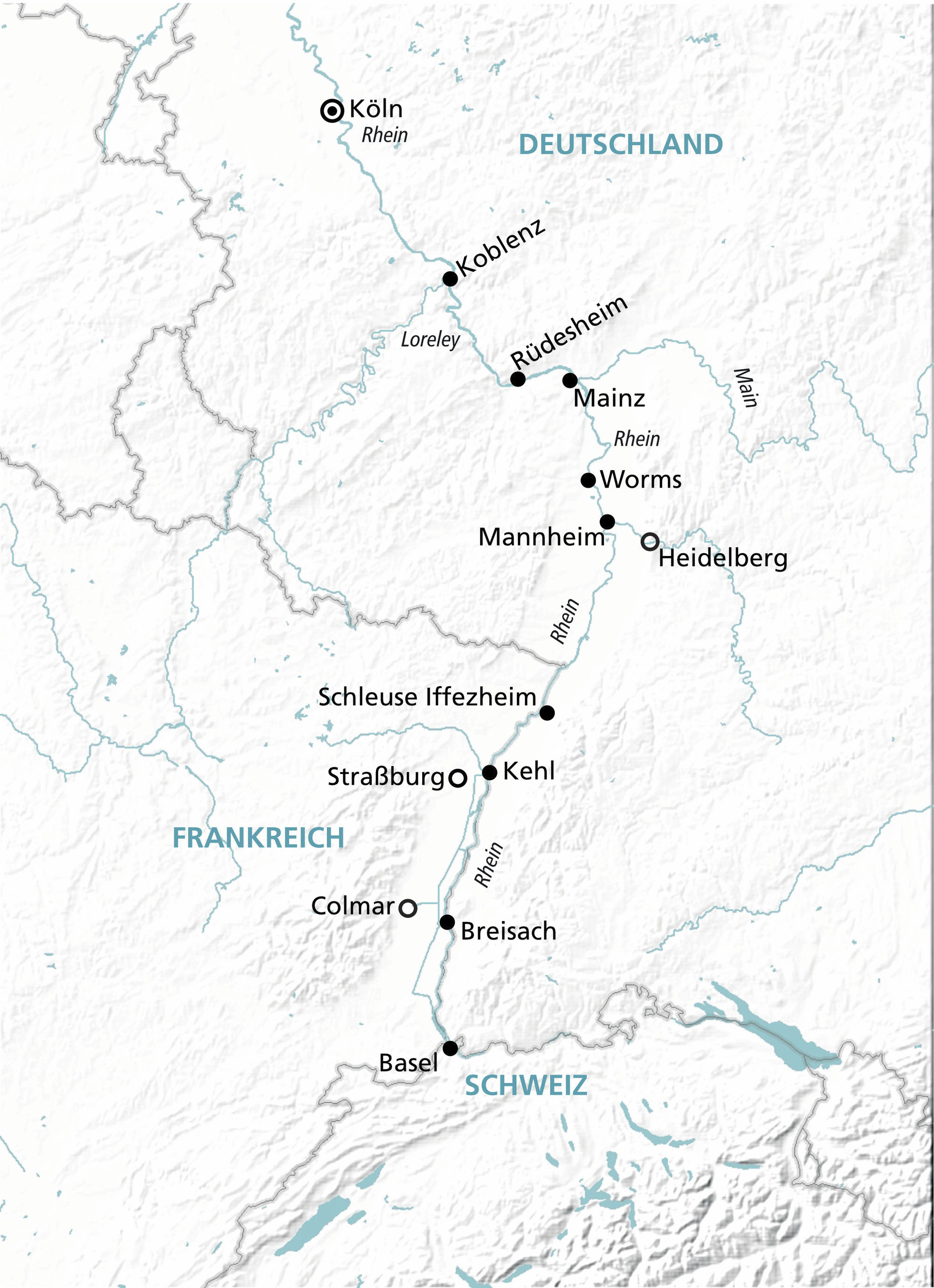 Köln -  Koblenz - Loreley - Rüdesheim - Mannheim - Straßburg/Kehl - Basel - Breisach - Worms - Mainz - Köln