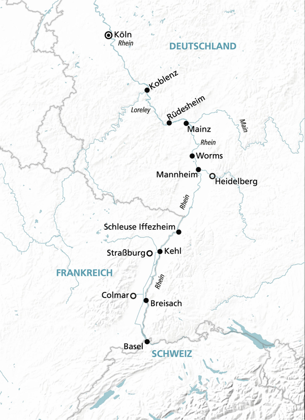Diese Rheinflussfahrt auf dem größten Fluss Deutschlands ist eine Reise wert. Freuen Sie sich darauf an Bord verwöhnt zu werden und interessante Landschaften zu genießen. Probieren Sie den Rheingauer Riesling bei einem Dämmerschoppen in der Rüdesheimer Drosselgasse. Heidelberg am Neckar mit seinem berühmten Schloss wartet nur darauf auf einem Ausflug von Ihnen entdeckt zu werden. Das Münster in Straßburg zeigt architektonische Meisterleistungen aus vergangenen Jahrhunderten. Eine Elsassrundfahrt mit Colmar ist ein Muss für jeden Straßburgbesucher. Viel zu kurz ist der Aufenthalt, bevor Sie durch den Breisgau nach Basel gelangen. Die ”Fasnacht“ dort ist über die Landesgrenzen hinaus bekannt. Aber die Stadt hat einiges mehr zu bieten. Eine Elsassrundfahrt mit Colmar ist ein Muss sowie Spaziergänge durch die aus Römerzeiten besiedelte Stadt Worms. Die Landeshauptstadt Mainz rundet Ihre Reise zu den Schätzen des Rheins ab.