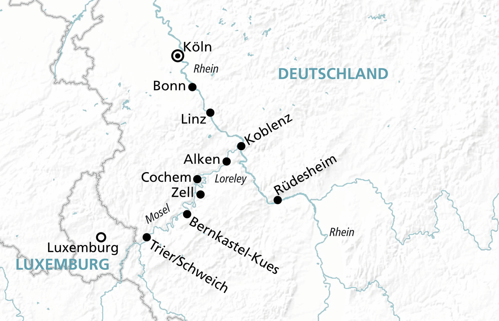 Köln - Bonn - Loreley - Rüdesheim - Alken - Zell - Bernkastel-Kues - Trier/Schweich - Cochem - Koblenz - Linz - Köln