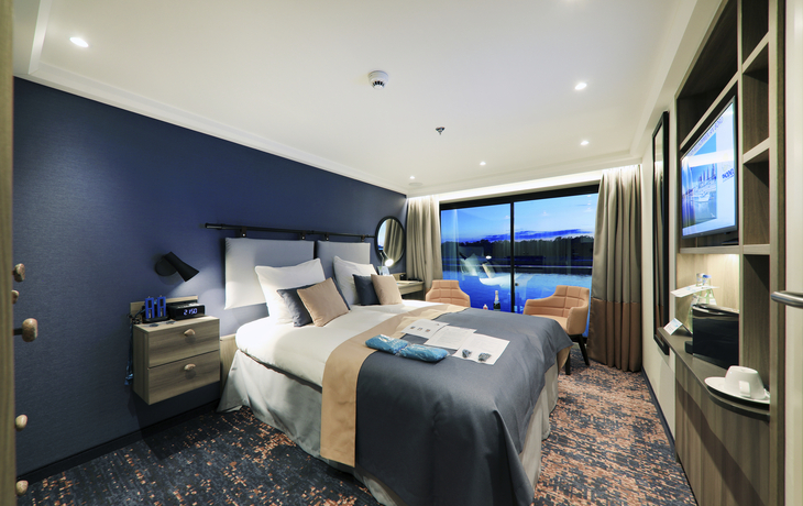 Alle Kabinen liegen außen und sind komfortabel und luxuriös eingerichtet und haben einen französischen Balkon.Die Betten lassen sich wahlweise als Doppel- oder Einzelbetten stellen.