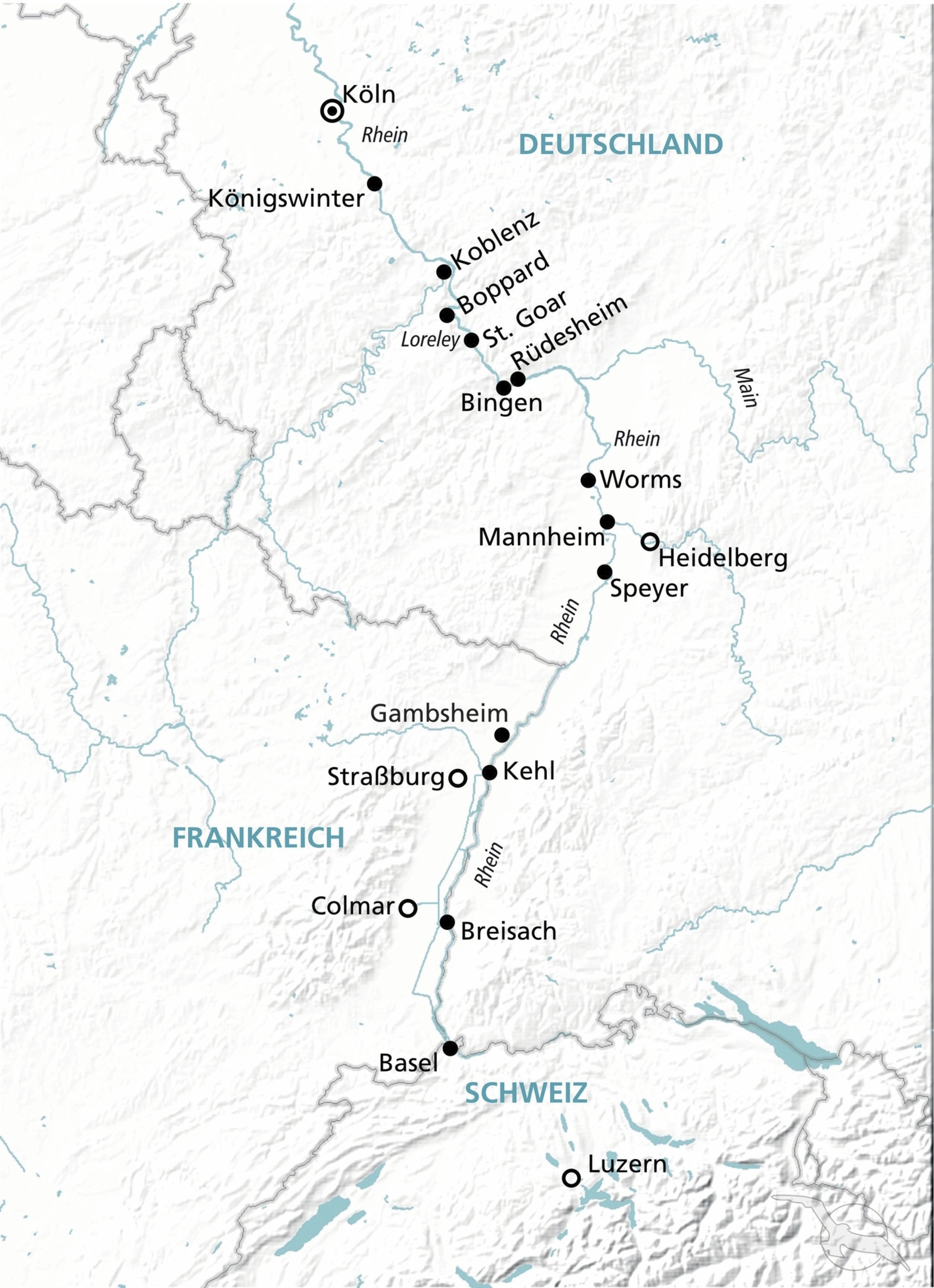 Köln - Boppard - Loreley - Rüdesheim - Mannheim - Straßburg/Kehl - Basel - Breisach - Worms - Köln