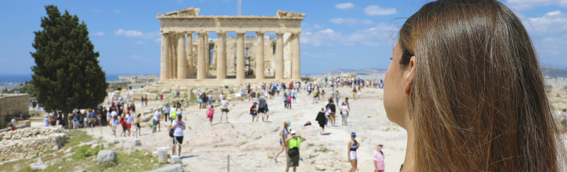 Besucher erkunden die Akropolis mit dem Parthenon im Hintergrund