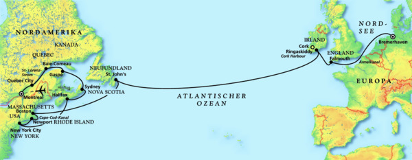 Montreal - Québec City - Gaspé - Sydney - Halifax - New York City - Boston - St. John's - Cork - Bremerhaven