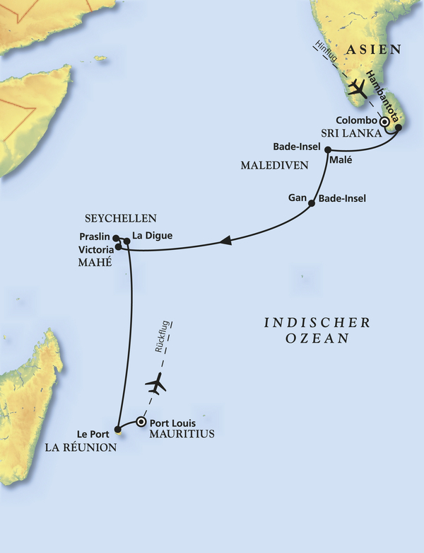 Colombo - Malé & Kuda Bandos - Victoria - Praslin - La Digue - Le Port - Port Louis