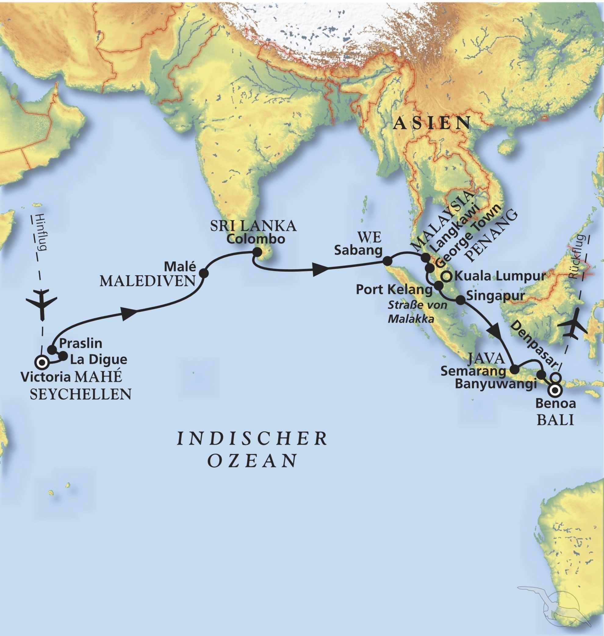 Sie fahren zunächst in den historischen Teil der Stadt zu der Stelle, an der einst Sir Stamford Raffles Singapur erreichte. Hier steigen Sie in ein lokales Boot um, welches Sie durch das Hafenviertel an der Mündung des Singapur-Flusses fährt. Die alten Warenhäuser in den engen Straßen beherbergen heute Restaurants und Bars. Nach der 30-minütigen Fahrt fahren Sie zur Waterloo-Street, wo in unmittelbarer Nähe ein chinesischer Tempel, ein Hindu-Tempel, eine jüdische Synagoge und eine katholische Kirche Zeugen vom friedlichen Miteinander der verschiedenen Religionen sind. Höhepunkt Ihres Ausflugs ist eine Fahrt mit dem "Singapore Flyer", einem Riesenrad, das spektakuläre Ausblicke auf die Stadt und den modernen Hafen bietet. Nach der etwa 30-minütigen Fahrt kehren Sie zum Schiff zurück.
