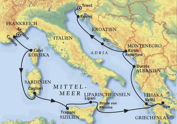 Monaco - Cannes - Calvi (Korsika) - Cagliari (Sardinien) - Itea - Vathi - Kotor - Vis - Rovinj - Triest