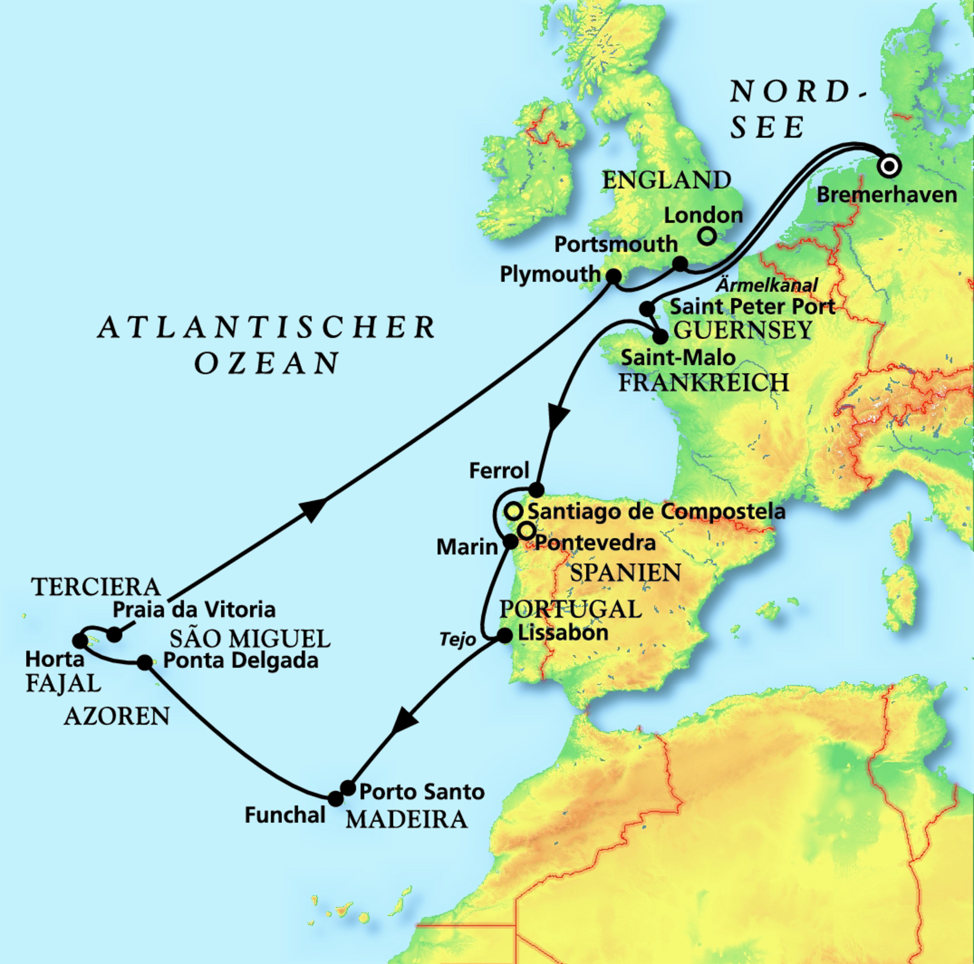 Bremerhaven - Saint Peter Port - Saint Malo - Ferrol - Lissabon - Funchal (Madeira) - Ponta Delgada - Plymouth - Portsmouth - Bremerhaven