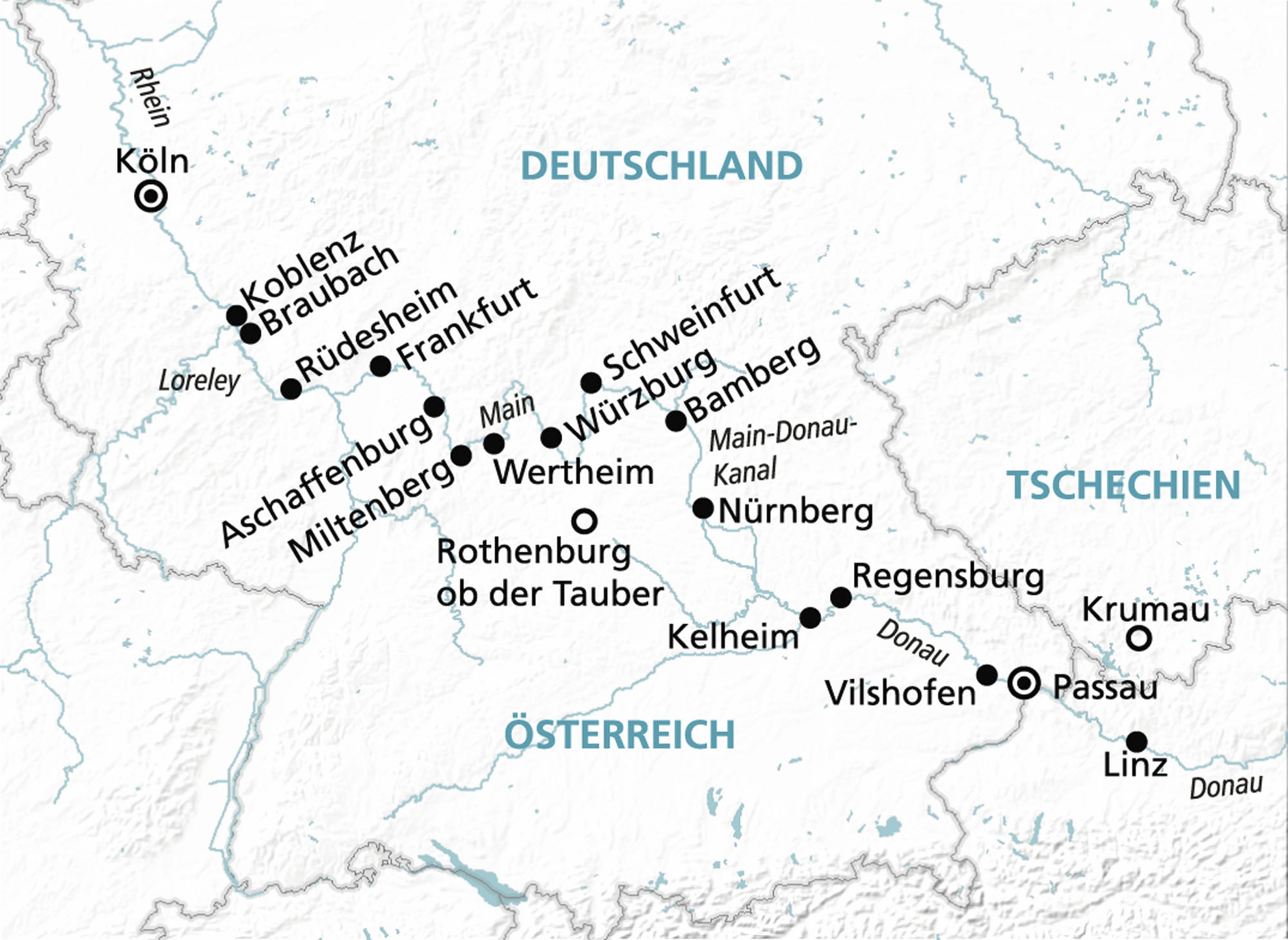 Köln - Frankfurt - Miltenberg - Würzburg - Bamberg - Nürnberg - Kelheim - Linz - Passau