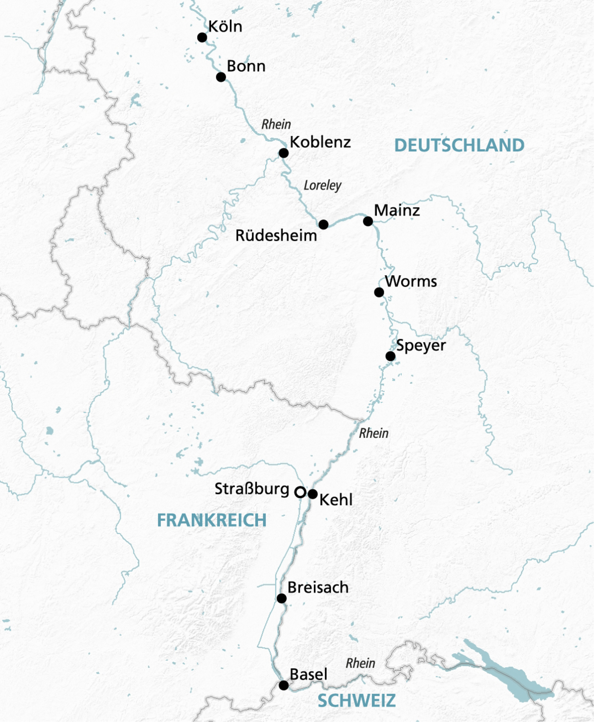 Köln - Bonn - Koblenz - Loreley - Rüdesheim - Mannheim - Straßburg - Basel - Speyer - Mainz - Köln