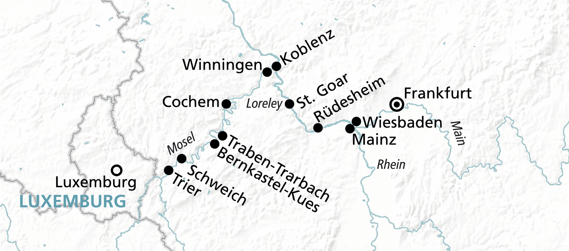 Unsere komfortable Andrea zeigt Ihnen in neun Tagen, was Main, Rhein und Mosel zu bieten haben. Von Frankfurt geht es nach Wiesbaden, bevor Ihr Schiff Sie entlang des romantischen Rheins auf die Mosel zu den schönen Winzerorten Cochem und Traben-Trabach fährt. Trier, eine der ältesten Städte Deutschlands, steht als nächstes auf dem Programm. Wir bieten Ausflugsmöglichkeiten nach Luxemburg-Stadt und in die Luxemburger Schweiz an. Über die Mosel, mit Stopp in Bernkastel-Kues, geht Ihre Reise nach Koblenz. Hier am Deutschen Eck biegt Ihr Schiff wieder in den Rhein ein. Bekannte Städtchen wie St. Goar und Rüdesheim laden zu einem Landgang ein. Nach einem Aufenthalt in Mainz erreichen Sie wieder Frankfurt.