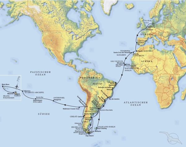 Hamburg - Rio de Janeiro - Puerto Madryn - Ushuaia - Buenos Aires - Valparaiso - Bora Bora - Moorea - Papeete