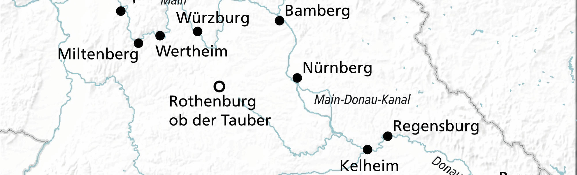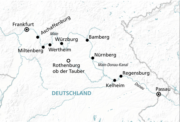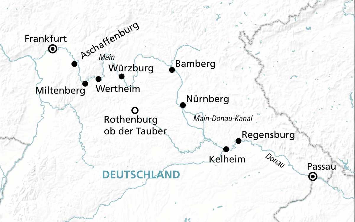 Frankfurt - Aschaffenburg - Miltenberg - Wertheim - Würzburg - Bamberg - Nürnberg - Main-Donau-Kanal - Kelheim - Regensburg - Passau