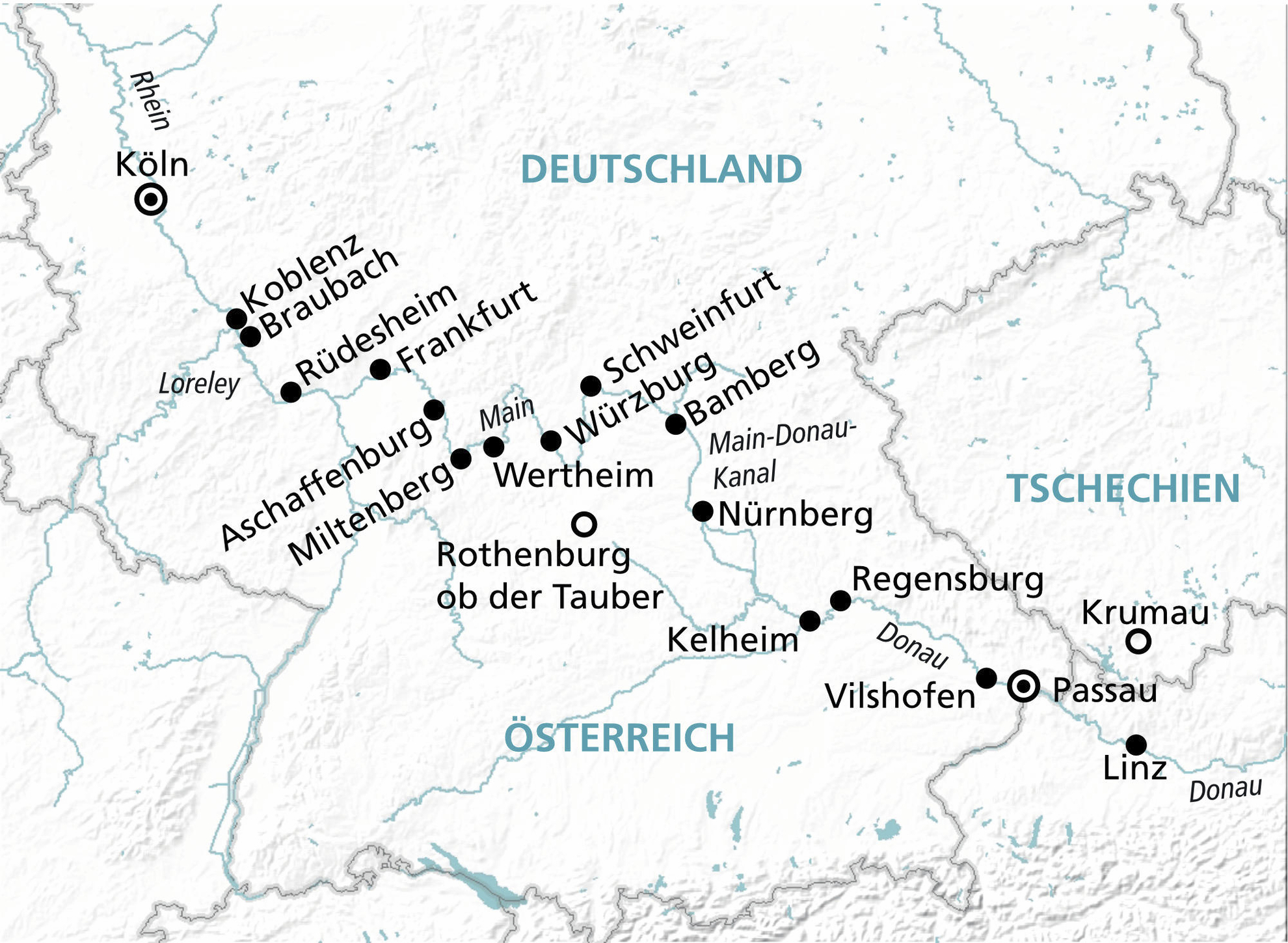 Köln - Braubach - Loreley - Rüdesheim - Frankfurt - Wertheim - Würzburg - Schweinfurt - Nürnberg - Main-Donau-Kanal - Regensburg - Linz - Passau