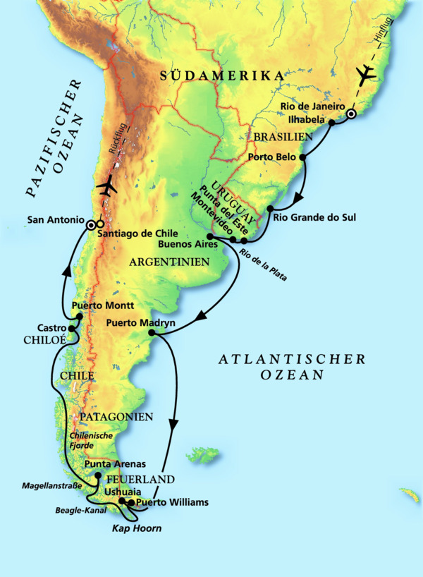 Rio de Janeiro - Montevideo - Buenos Aires - Puerto Madryn - Ushuaia - Kap Hoorn - Punta Arenas - Castro - San Antonio