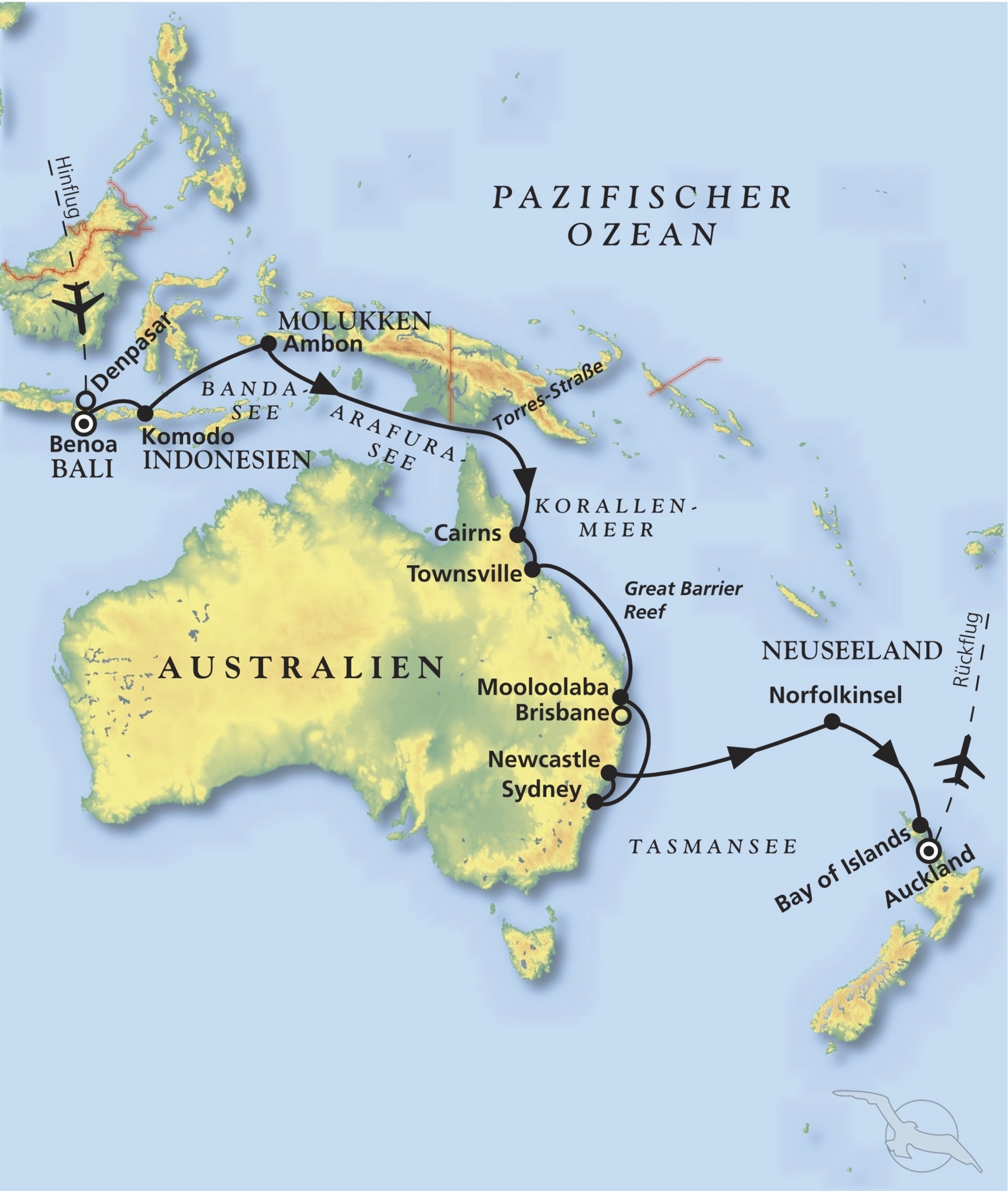 Die Norfolkinsel, 1774 von Kapitän Cook entdeckt, war Ende des 18.Jh. und Anfang des 19.Jh. eine gefürchtete britische Sträflingskolonie, die – nach Bekanntwerden der menschenverachtenden Umstände - 1855 schließlich geschlossen wurde. 1856 siedelten sich die Nachkommen der Bounty-Meuterer und ihre Familien auf der Insel an, die bis dahin auf der tausende Kilometer entfernt gelegenen Insel Pitcairn Zuflucht gefunden hatten. 1914 wurde die Insel zu einer australischen Region. Heute ist – neben der Landwirtschaft zur Selbstversorgung - der Tourismus von großer wirtschaftlicher Bedeutung, und die Naturschutzgebiete sowie die Hinterlassenschaften der wechselvollen Geschichte sind Anziehungspunkte für Touristen aus aller Welt. Sie fahren in Kleinbussen zum Aussichtspunkt "Queen Elizabeth" und genießen den Blick auf die vorgelagerten Felseninseln. Sie passieren das Regierungsgebäude, die zwischenzeitlich restaurierte Sträflingssiedlung in Kingston (auf der Liste des UNESCO-Welterbes geführt), den Friedhof und die Emily Bucht, deren feinsandiger Strand zu den 10 schönsten in Australien gewählt wurde. Von der "Lone Pine" genießen Sie den Ausblick auf die Emily und Slaughter Buchten mit kristallklarem Wasser und schönen Sandstränden. Sie fahren vorbei am Naturreservat und sehen die majestätischen zweihundert Jahre alte "Moreton Bay"-Feigenbäume, ein ideales Fotomotiv. Nach dem Stopp geht es wieder zurück zum Schiff.