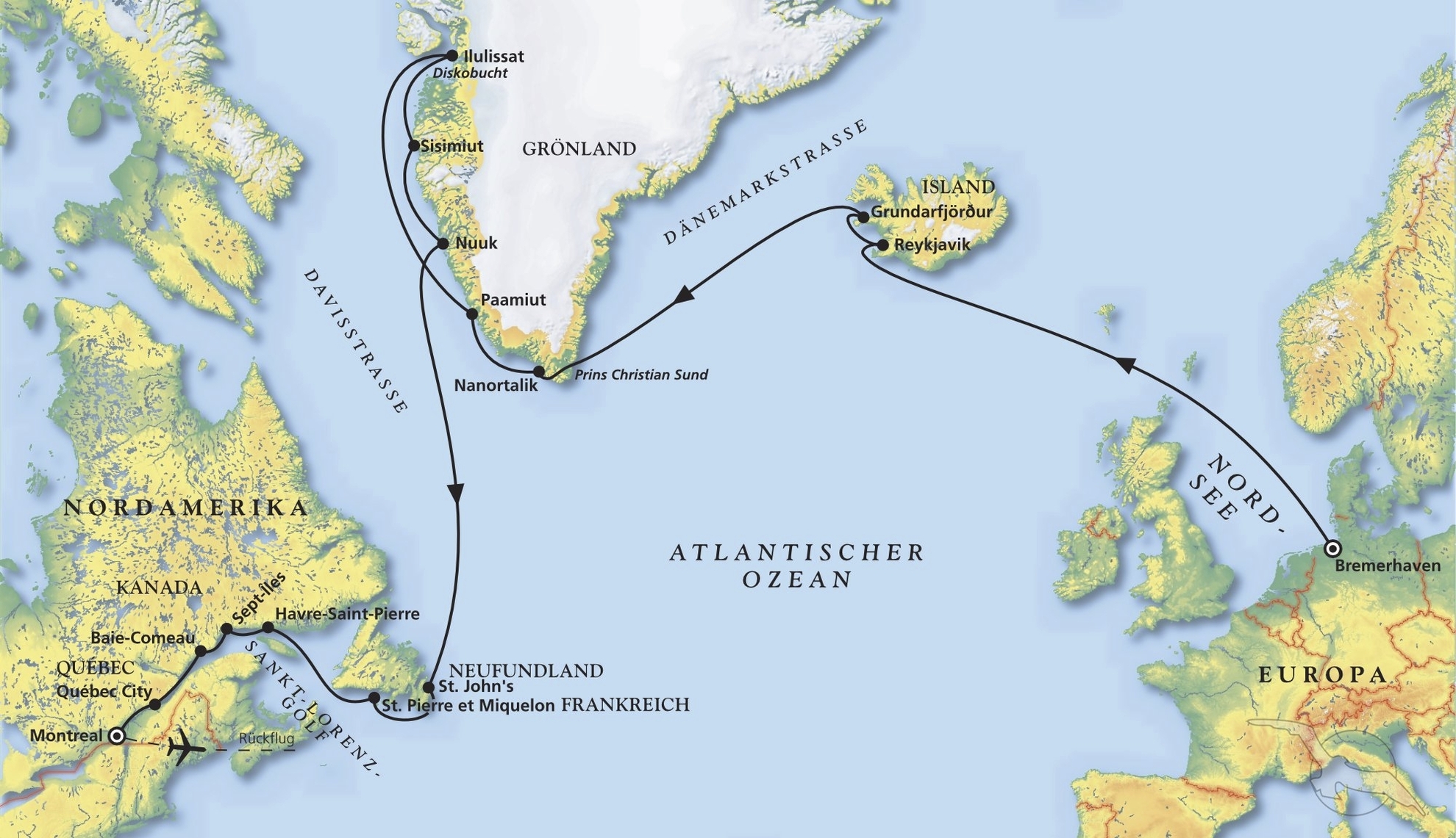 Bremerhaven - Reykjavik - Nanortalik - Paamiut - Ilulissat - Sisimut - Nuuk - St. John´s - Québec City - Montreal