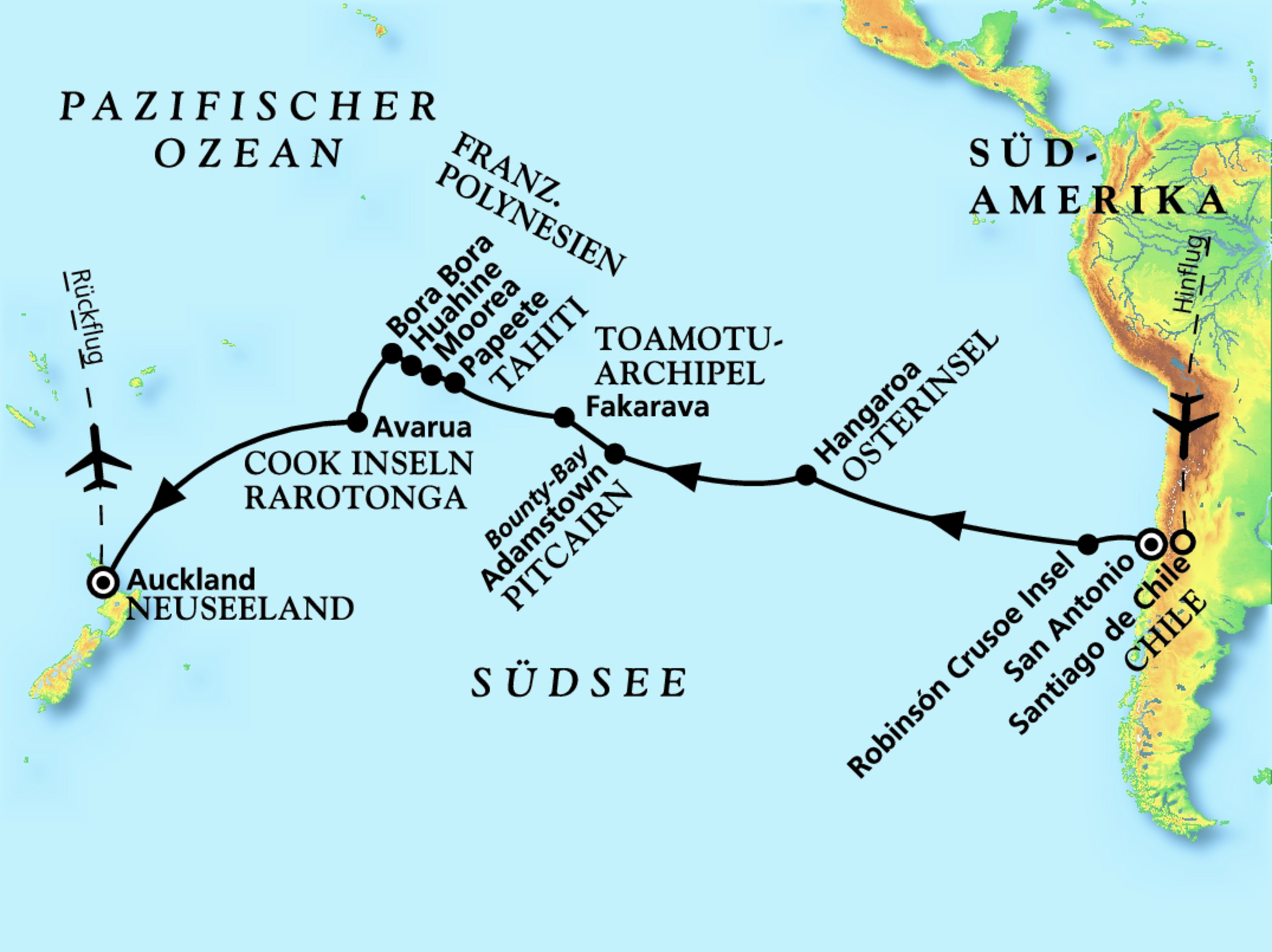 San Antonio - Robinson Crusoe Insel - Hangaroa - Adamstown - Fakarava - Papeete - Moorea - Bora Bora - Auckland